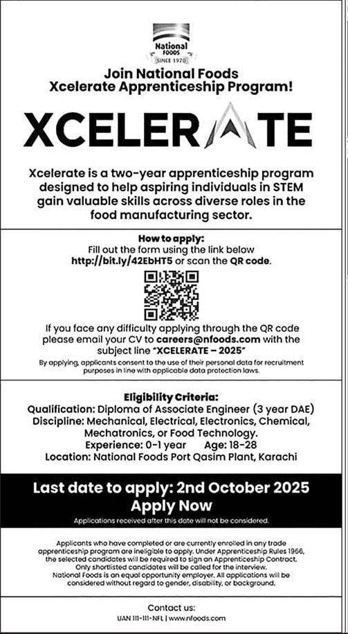 National Foods Limited is inviting applications for its Xcelerate Apprenticeship Program 2025 at the Port Qasim Plant, Karachi. This two-year program provides an excellent opportunity for fresh DAE diploma holders to gain hands-on experience in the food manufacturing industry. Candidates with a background in Mechanical, Electrical, Electronics, Chemical, Mechatronics, or Food Technology can apply online and start their professional careers with one of Pakistan’s leading companies.