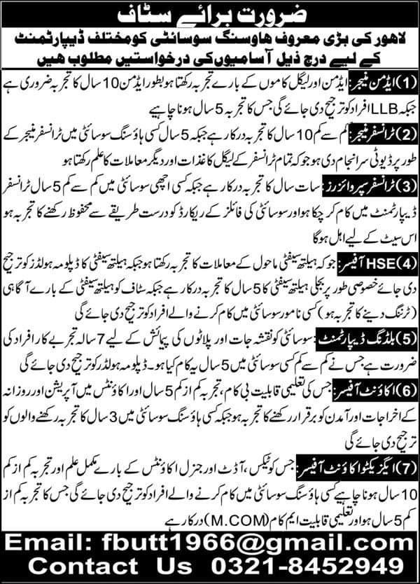 The renowned housing society in Lahore is seeking applications for various positions in different departments: