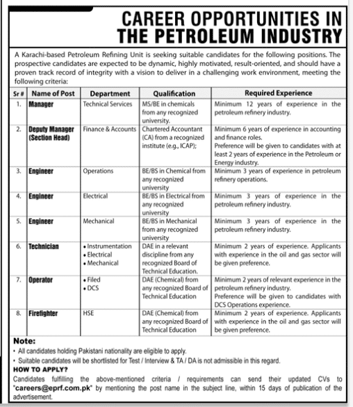 A Karachi-based Petroleum Refining Unit has announced exciting career opportunities for qualified professionals. Vacancies include Manager, Deputy Manager (Finance & Accounts), Engineers (Chemical, Electrical, Mechanical), Technicians, Operators (Field/DCS), and Firefighter (HSE) roles. These positions are ideal for experienced candidates seeking stable and growth-oriented careers in the oil and gas refinery sector in Karachi, Pakistan.
