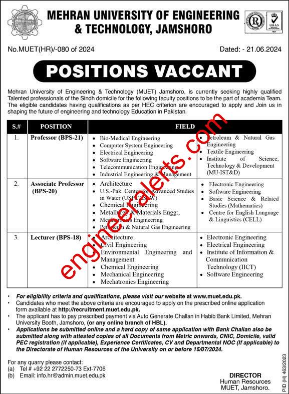 Mehran University of Engineering & Technology (MUET) Jamshoro, is currently seeking highly qualified and talented professionals of Sindh domicile for the following faculty positions to be part of our academic team. Eligible candidates with qualifications as per HEC criteria are encouraged to apply and join us in shaping the future of engineering and technology education in Pakistan.