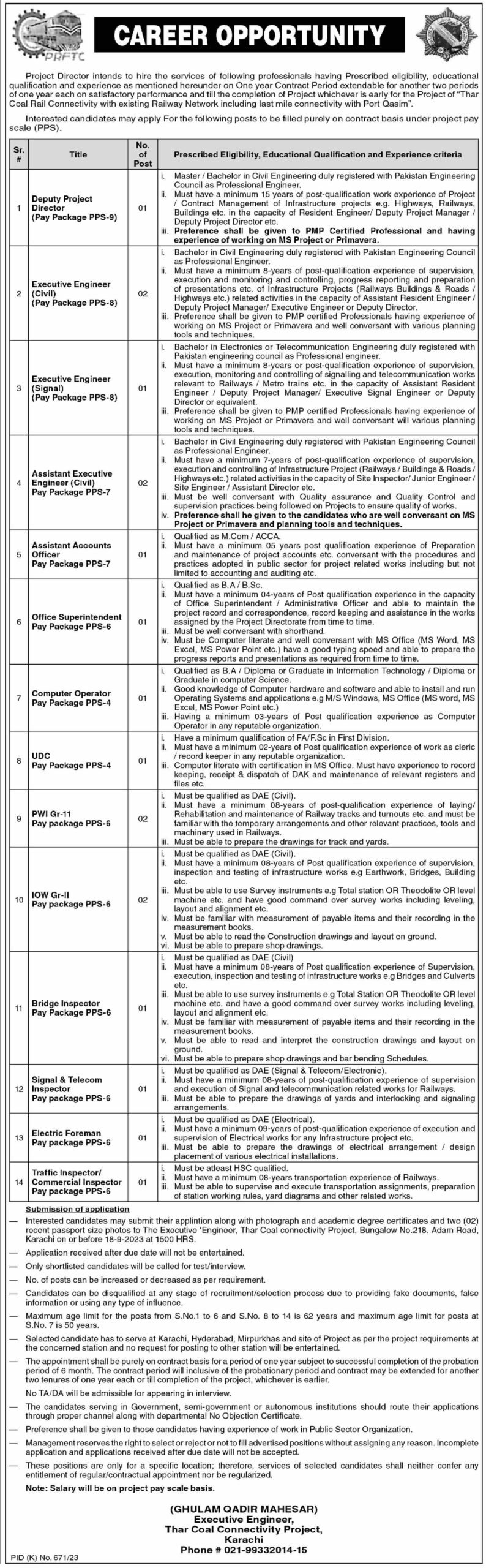 Attractive Thar Coal Connectivity Project Karachi Jobs 2023-Apply Now. Explore exciting career opportunities at Thar Coal Connectivity Project Karachi, Pakistan. We are currently hiring for various positions, including Assistant Account Officer, Computer Operator, UDC, Officer Superintendent, Signal Telecom Inspector, PWI Gr, Assistant Executive Engineer (Civil), Traffic Inspector, Deputy Project Director, Low Gr, Executive Engineer (Civil), Executive Engineer (Signal), Bridge Inspector, and Electric Foreman. Join and be part of a dynamic team in one of the country’s innovative projects.