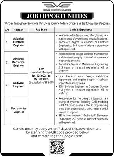 Winged Innovative Solutions Pvt Ltd announces exciting career opportunities for talented engineers including Avionics/Electrical Engineer, Airframe/Mechanical Engineer, Software Engineer, and Mechatronics Engineer. These roles offer strong growth, competitive packages, and exposure to advanced technologies. Eligible candidates with relevant qualifications and experience should apply online within seven days to join a forward-looking organization and build rewarding long-term careers in Pakistan nationwide.