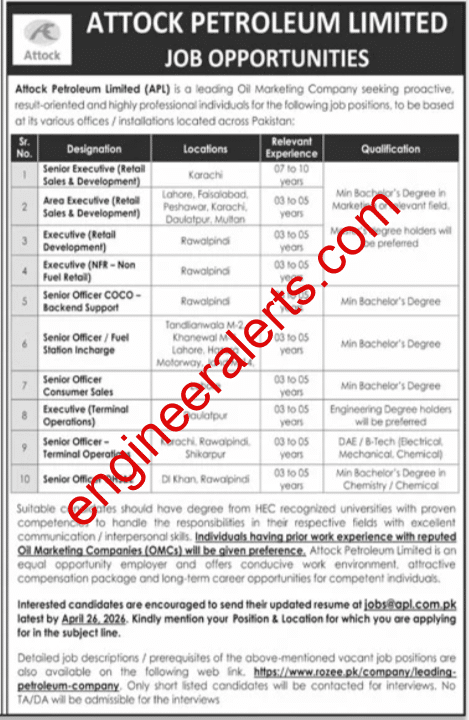 Attock Petroleum Limited (APL), a prominent member of the Attock Group of Companies, has announced various career opportunities for 2026. As a leader in the downstream energy sector, APL is looking for proactive, result-oriented professionals to manage its expanding retail network and terminal operations across Pakistan. This recruitment drive is ideal for individuals with a background in Marketing, Engineering, and Chemistry who wish to work in a high-performance corporate culture.