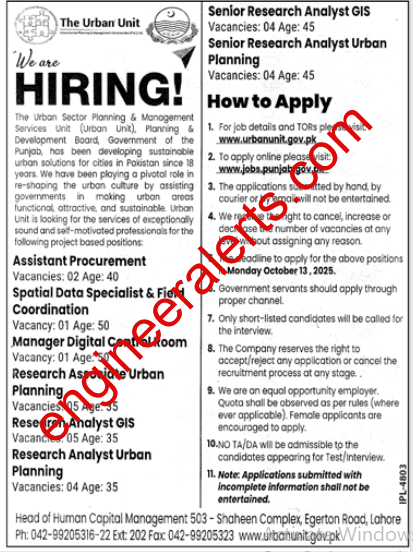 The Urban Sector Planning & Management Services Unit (Urban Unit), Government of the Punjab has announced multiple vacancies for highly skilled professionals. Positions include Assistant Procurement, Spatial Data Specialist & Field Coordination, Manager Digital Control Room, Research Associate Urban Planning, Research Analyst GIS, and Senior Research Analyst Urban Planning. Eligible candidates are invited to apply online before the deadline.