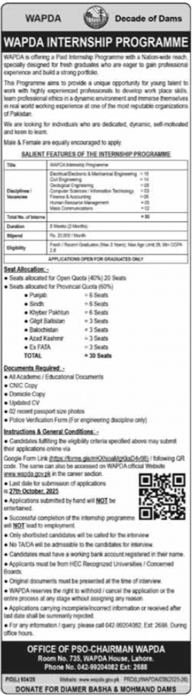WAPDA invites applications for its Paid Internship Programme 2025, offering fresh graduates a golden chance to gain hands-on experience. This two-month internship includes vacancies in Electrical/Mechanical Engineering, Civil Engineering, Geological Engineering, Computer Sciences, Finance & Accounting, HRM, Mass Communication, and Business Administration. Both male and female graduates from across Pakistan are encouraged to apply.