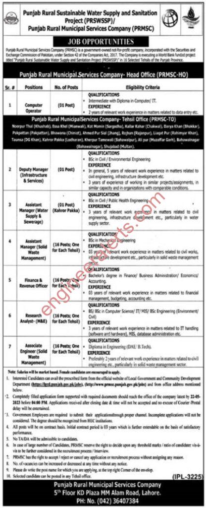 Punjab Rural Municipal Services Company Lahore has announced following positions