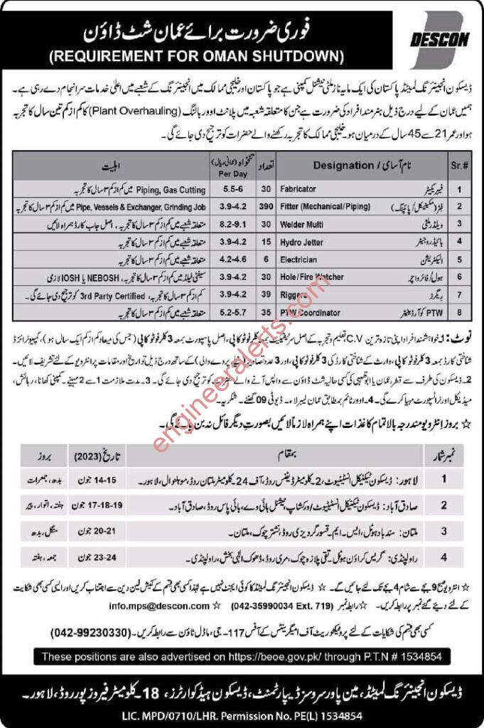 Walk-in Test Interview Jobs For Oman And Kuwait 2023.Descon Engineering Limited Pakistan is a well-known company that provides excellent engineering services in Pakistan and Gulf countries. We urgently need skilled individuals for the following positions related to Plant Overhauling in Oman. Candidates should have at least three years of experience in the relevant field and their age should be between 21 and 45 years. Candidates with experience in Gulf countries will be given priority.